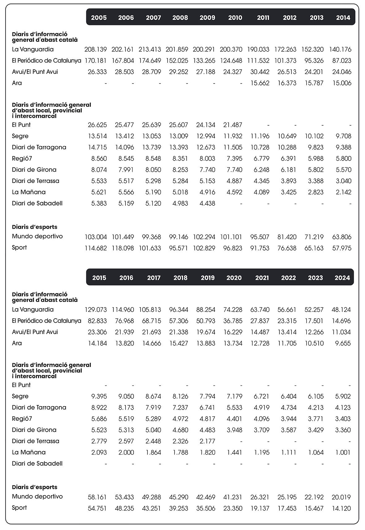 Les dades que aportem mostren de forma clara la caiguda dràstica en la difusió dels diaris catalans, per bé que amb un ritme diferent. Per al líder absolut dels diaris d’abast català, La Vanguardia, s’inicia amb més contundència a partir de 2011, quan es queda per sota dels 200.000 exemplars de mitjana diària, i ja no ha deixat de reduir la xifra: cau dels 100.000 exemplars el 2018 i dels 50.000 el darrer exercici amb dades completes (2024). Per al segon diari en difusió, El Periódico de Catalunya, la reducció s’observa ja el 2008, cinc anys després ja se situa per sota dels 100.000 exemplars i el 2019 frega els 50.000, per baixar ja per sota dels 15.000 l’últim any. L’Avui va anar trampejant per damunt dels 20.000 exemplars tot el període fins al 2011, quan va ser absorbit per El Punt i unificat sota la marca El Punt Avui. Passat el primer exercici tornà a aquestes xifres, però des de 2019 va caure per sota de 20.000 exemplars, amb una pèrdua progressiva que el va dur fins als 11.000 exemplars de 2024. L’Ara ha difós fins als darrers anys al voltant dels 15.000 exemplars en paper cada dia, però també des de 2019 ha observat la caiguda progressiva fins a baixar dels 10.000 l’any 2024. Val a dir, però, que –sempre d’acord amb l’auditoria de l’OJD– manté almenys des de 2019 una xifra important d’exemplars amb difusió rèplica digital per sobre dels 20.000 exemplars, que el convertirien de fet en el segon diari d’informació general en català.
