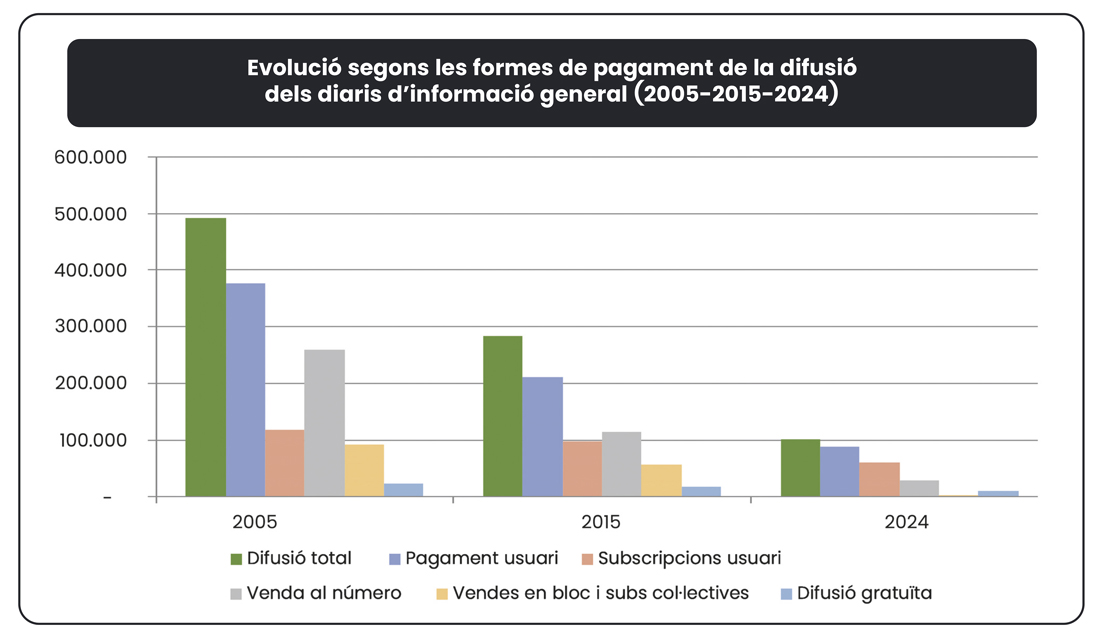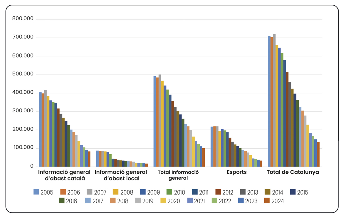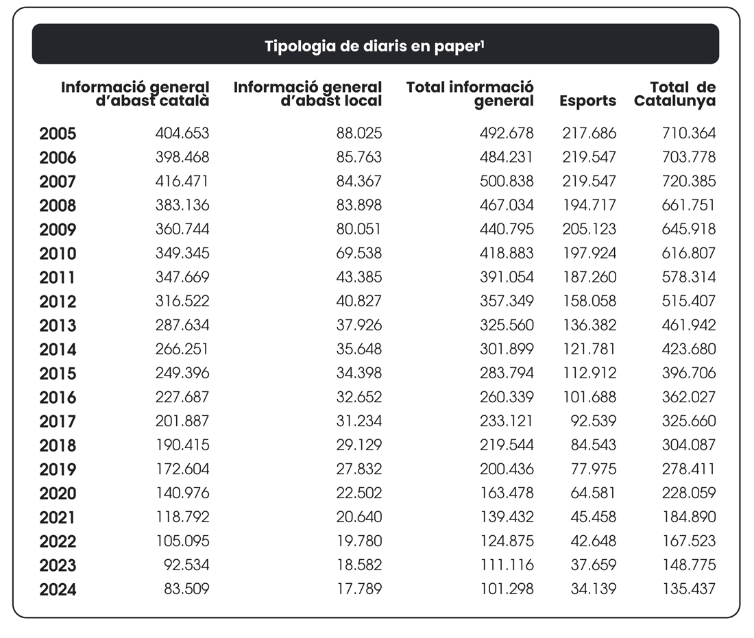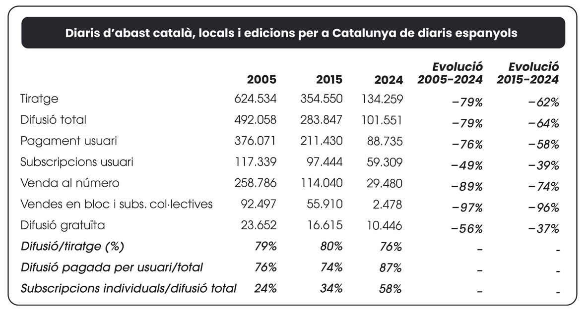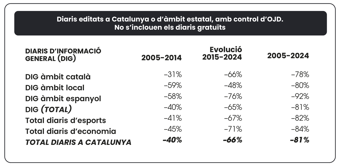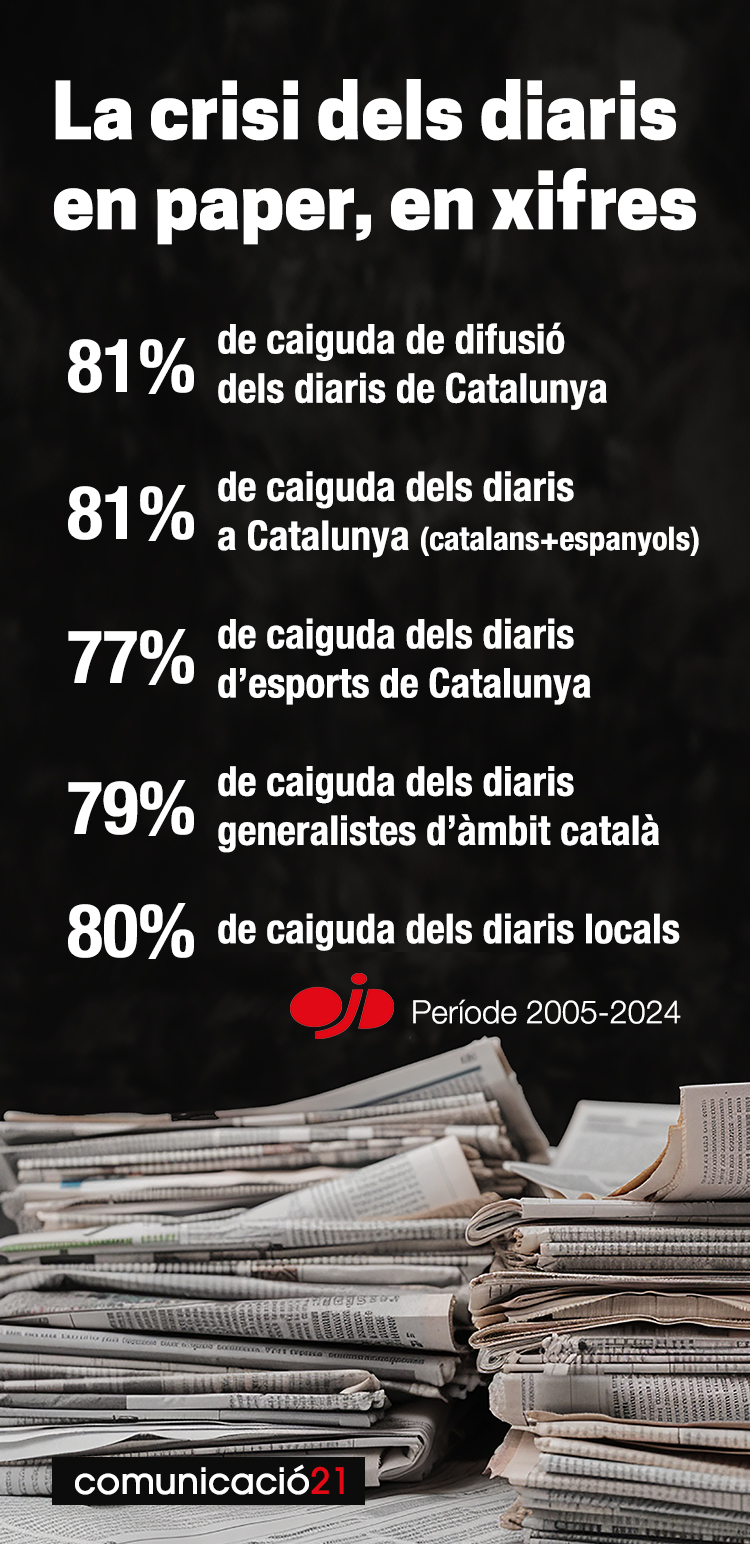 Des del 2005 fins al 2024, la difusió dels diaris a Catalunya amb control d’OJD es va reduir el 81%. Per segments, els diaris generalistes d’abast espanyol són els més afectats, ja que han perdut el 92% de la difusió que tenien el 2005, mentre que els generalistes d’abast local i nacional de Catalunya “només” van baixar entre el 78% i el 80%.
