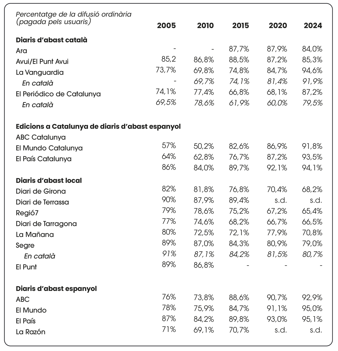 Per a les publicacions d’abast català, es pot comprovar que una immensa majoria dels exemplars són pagats pels propis usuaris, però amb alguns matisos. Destaca en primer lloc que el líder del mercat, La Vanguardia, va passar de tenir un 74% de la difusió pagada pels lectors el 2005 al 70% cinc anys després, però a partir d’aquest moment remunta fins al punt que l’any 2024 només el 5% de la difusió era pagada per tercers o gratuïta, tot i que per a la versió en català la xifra puja al 8%. Pel que fa a El Periódico, que entre 2015 i 2020 va arribar a tenir més del 30% de la difusió no pagada pels lectors i lectores, l’any 2024 aquesta dada s’havia corregit a la baixa, amb un 13% del total. L’edició en català, però, s’acostava al 40% de difusió no pagada pels lectors el 2015 i el 2020 (any anòmal per la pandèmia), però el 2024 encara superava el 20%. En canvi, els diaris en paper només en català, El Punt Avui i l’Ara, han mantingut una estabilitat més gran, sempre entre el 85% o més de difusió pagada pels propis usuaris.