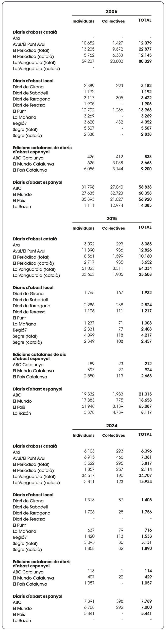 El 2015, la reducció dràstica de subscripcions col·lectives als grans diaris va afectar de forma aguda el pes d’aquesta forma de comercialització de la premsa, però també entre les individuals va baixar el resultat, amb l’excepció d’El País i La Vanguardia. El darrer exercici, el de 2024, mostra la caiguda de gran magnitud en el primer diari espanyol i de prop de la meitat dels subscriptors individuals en el cas del líder de Catalunya.