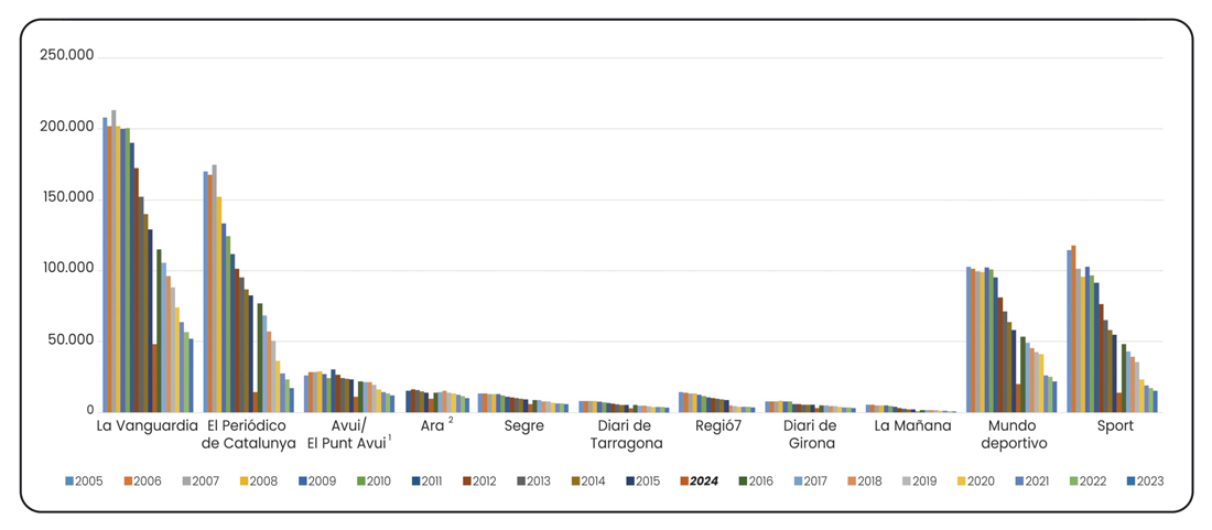 L’informe parteix de dues taules/gràfics que mostren la xifra absoluta de difusió de cada capçalera sotmesa al control d’OJD per a cada any al llarg del període 2005-2024, agrupades en les categories que semblen pertinents per a l’anàlisi: premsa d’informació general, d’abast per a tot Catalunya o d’abast local (provincial, intercomarcal, municipal) però també la d’àmbit estatal que arriba a Catalunya o hi té/tenia edicions específiques, i premsa especialitzada en esports i en economia.