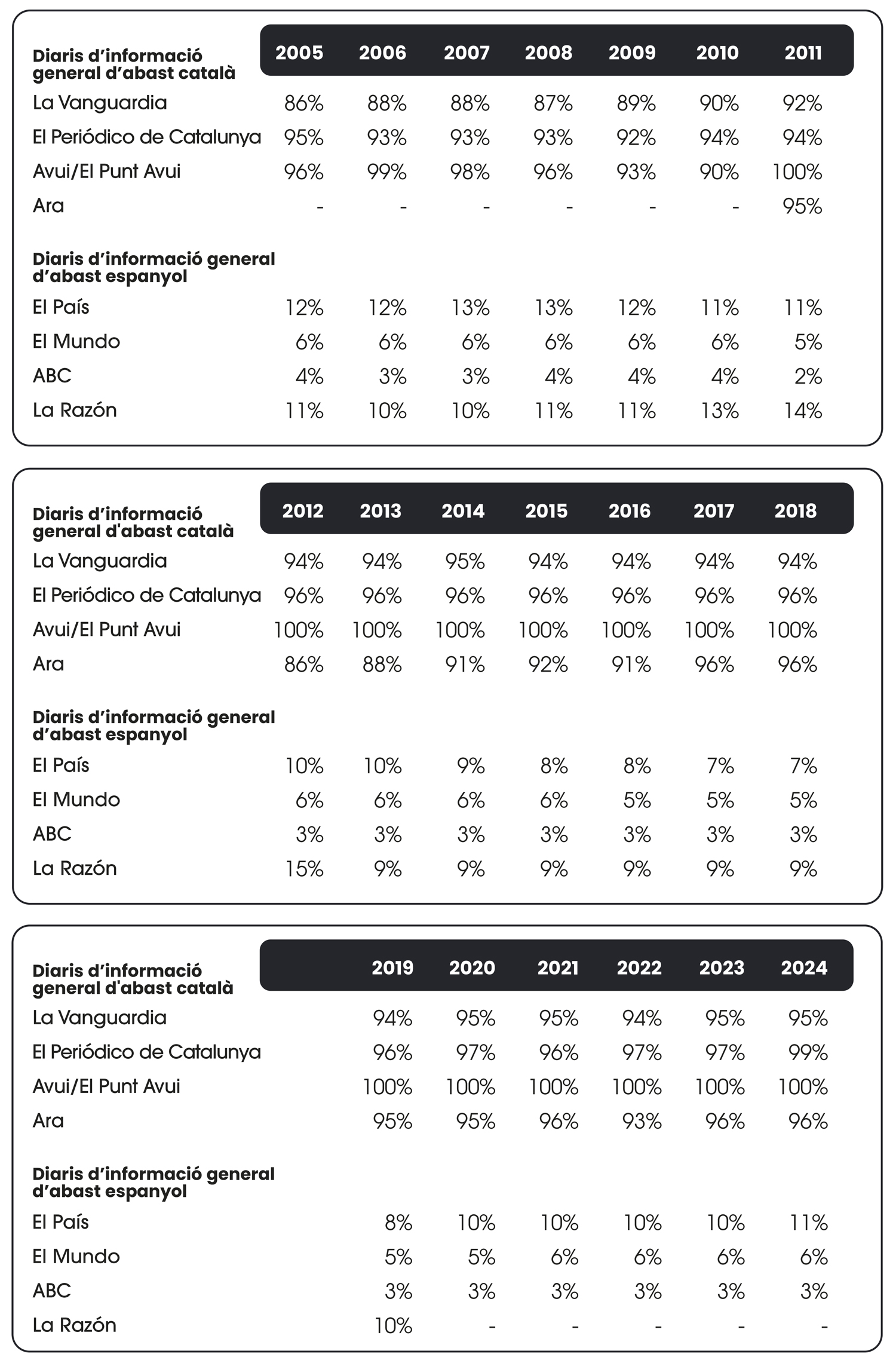De les dues taules, una fa referència a la difusió dels diaris de Catalunya, allà on sigui. L’altra informa de la difusió a Catalunya de les capçaleres de Catalunya i la dels diaris espanyols que hi tenen una presència significativa: els quatre generalistes i els dos d’esports, a més dels especialitzats en economia, amb escassa implantació en paper.