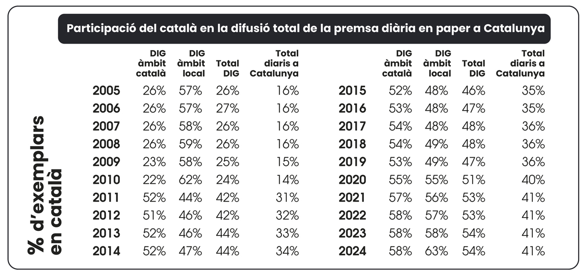 La quota d’exemplars en català entre els diaris a Catalunya ha progressat molt favorablement, per l’impacte de l’edició en aquesta llengua de La Vanguardia a partir de 2011, seguint el que molts anys abans havien fet Segre i El Periódico, però també per l’aparició de l’Ara fa 15 anys. Aquesta doble circumstància va facilitar doblar també la difusió total d’exemplars en català, passant del 16% de 2005 al 32% el 2011, però des d’aquesta data ha seguit augmentant el seu pes, fins a estabilitzar-se els darrers exercicis en el 41% del total. És a dir, la caiguda de la premsa en castellà és superior a la del català.