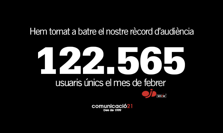 Comunicació 21 ha tornat a superar el seu sostre d’audiència assolint els 122.565 usuaris únics al mes de febrer, segons l’auditoria d’OJDinteractiva. La publicació especialitzada en el sector de la comunicació i en català des de 1999 té més a prop el rumb d’un creixement sostingut amb l’objectiu de superar els 150.000 usuaris únics al llarg del 2026.