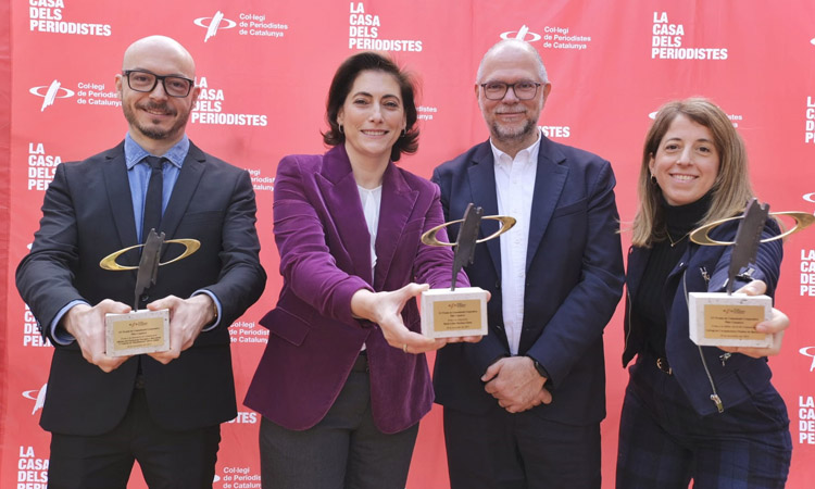 Sergi Barrera, Maria Lluïsa Martínez i Anna Bellorbí, amb el degà del Col·legi de Periodistes, Joan Maria Morros [foto: Jordi Salinas].