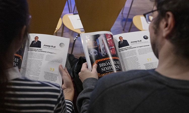 Dos assistents a la gala llegint l’article del president Rull a la revista Exterior [foto: Joanna Chichelnitzky].