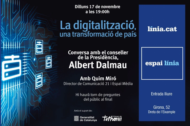 En aquest sentit, la conversa de l’Espai Línia abordarà alguns dels grans eixos de la digitalització del país i els primers passos impulsats pel Govern al respecte: l’ampliació de la xarxa de fibra òptica arreu de Catalunya; la inversió en centres de dades per garantir-ne el bon funcionament; l’aplicació ètica de la intel·ligència artificial; la digitalització de la justícia, o la necessitat de potenciar la ciberseguretat perquè tot això avanci en un entorn que sigui segur per a tothom.