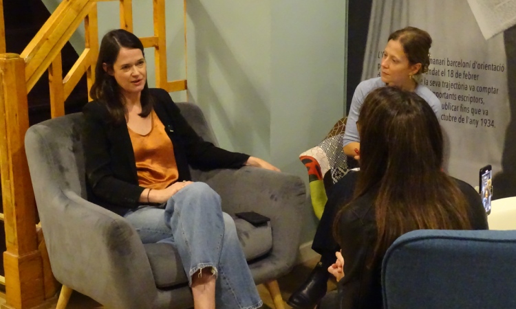 Sophie Gilbert, acompanyada de la seva traductora i de l’editora de Raig Verd, Laura Huerga [foto: Espai Línia].