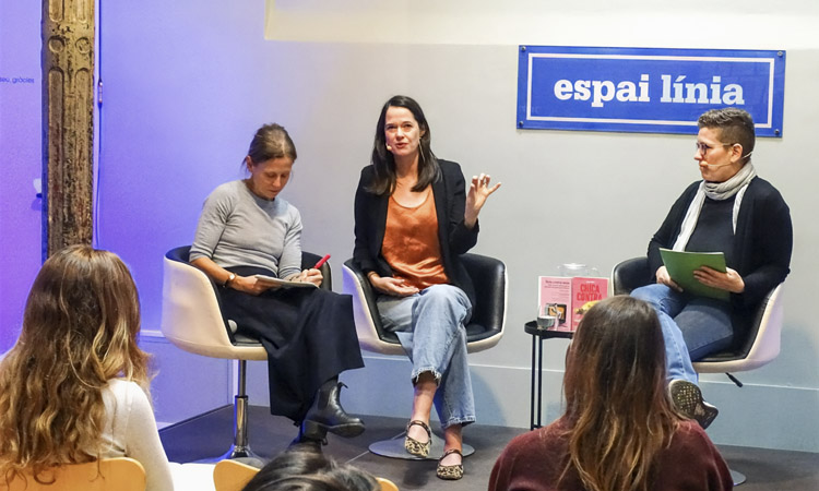 Sophie Gilbert, acompanyada de la seva traductora i de l’editora de Raig Verd, Laura Huerga [foto: Espai Línia].